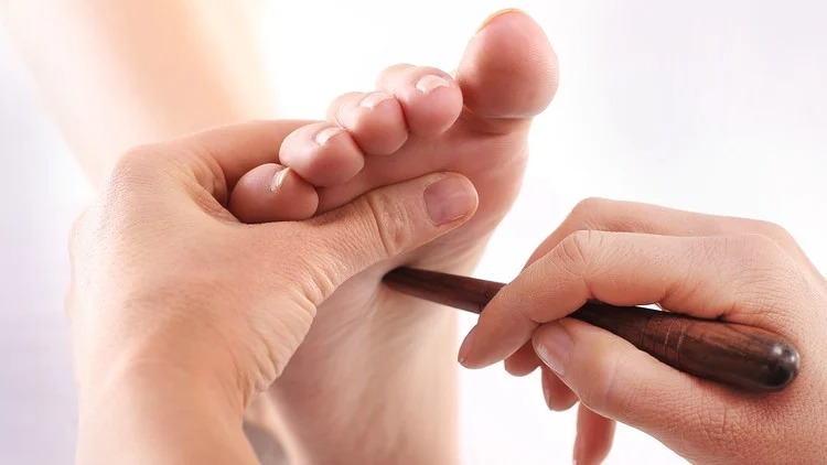 Revitalizing boost using the Thai stick to activate key foot reflex zones for energy balance and relaxation.
